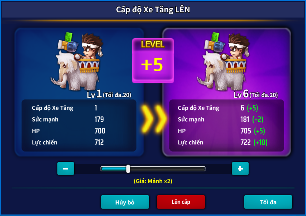 - Xe tăng có thể tăng cấp độ bằng cách kiếm EXP tank từ các trận đấu PvP, hoặc sử dụng Mảnh Gear để tăng level ngay lập tức