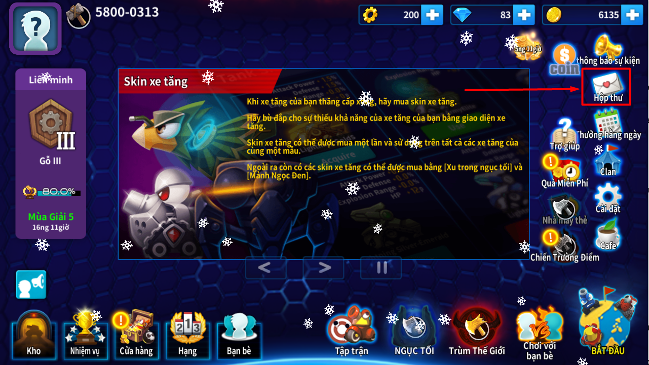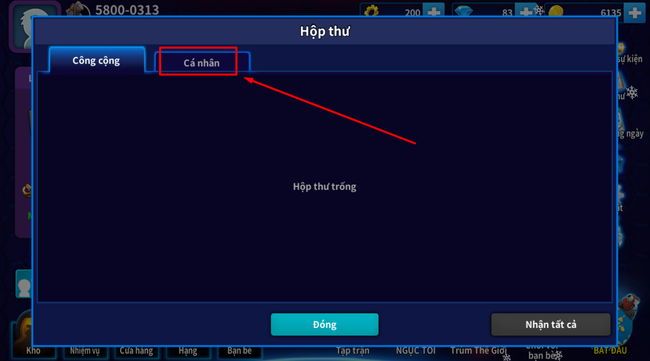 - Bước 5: Trong game, bấm vào Hộp thư - Cá nhân để kiểm tra và nhận quà